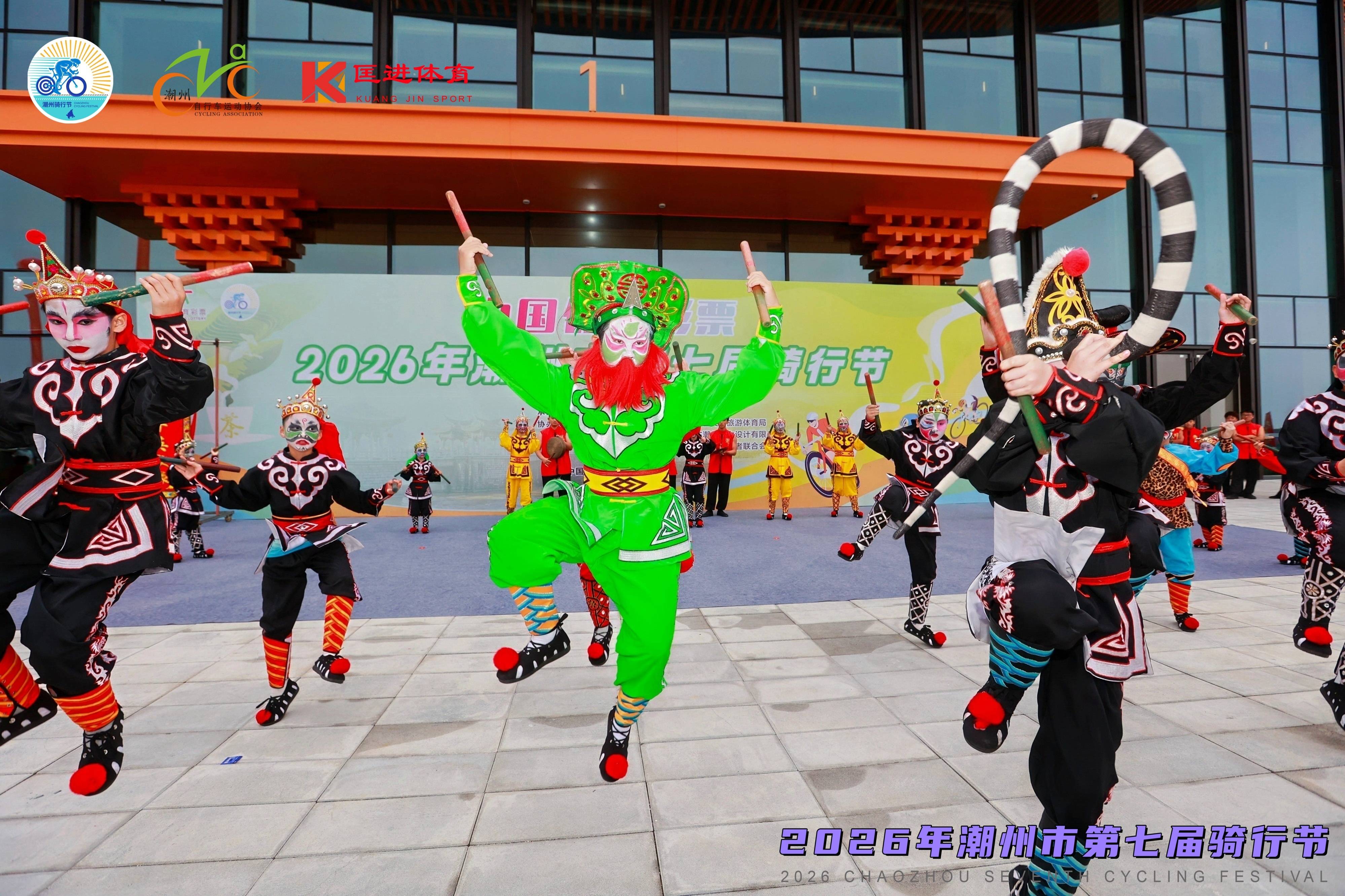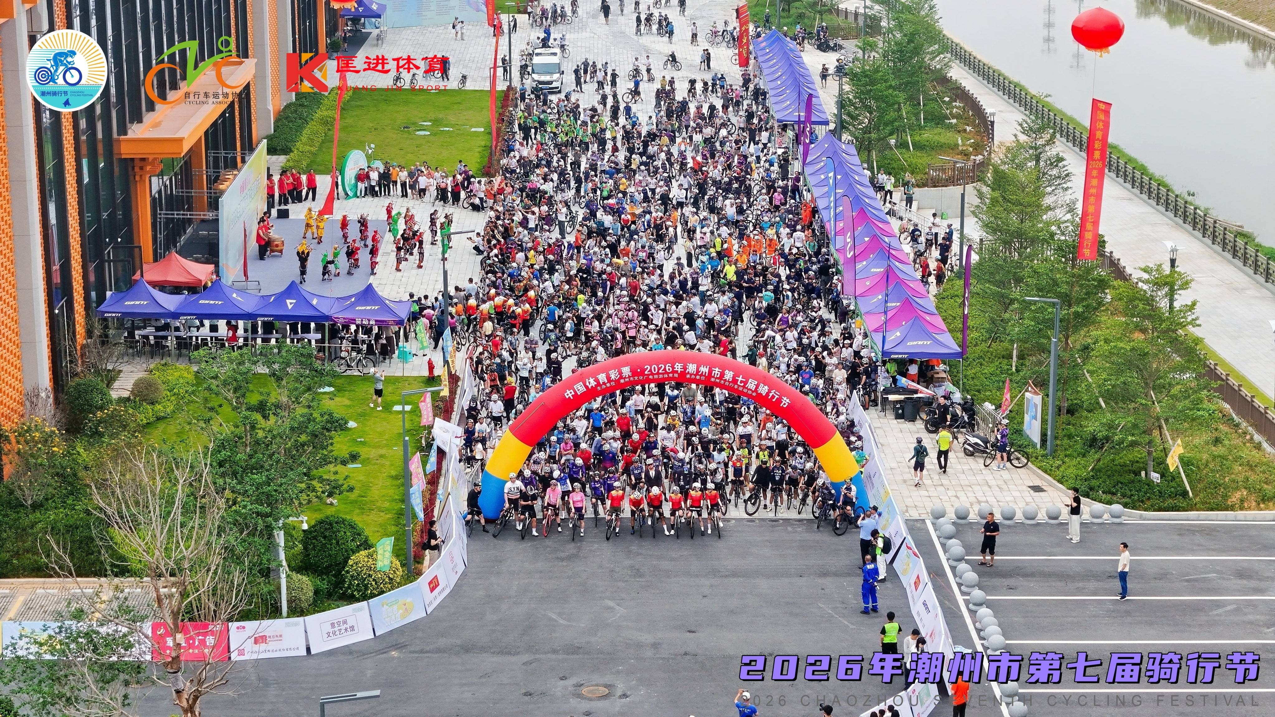 活动当天,潮州国际会展中心人气爆棚、气氛热烈。清晨,骑手们陆续抵达会展中心完成签到集结,现场秩序井然;启动仪式上,震撼的英歌舞与激昂的二十四节令鼓表演轮番上演,将现场氛围推向高潮,骑手们精神抖擞、整装待发。随着发令声响,骑行队伍如长龙般从潮州国际会展中心出发,以车轮为媒,穿越湘桥、饶平的山水人文,在追风逐梦间感受潮州的生态之美与人文底蕴。